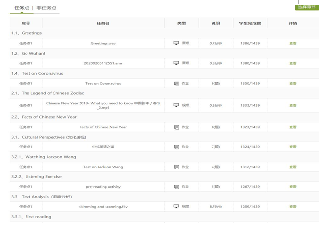 自2月6日开放学习通线上课程资源至2月24日,学习通上共发布包含音视频、图书、期刊等拓展资料、各类测试题和教学短视频等类型的19个任务点,9次通知,2次作业,4次签到,1次讨论,访问量65,129次。据学习通后台数据统计,已开放学习章节学生的任务点完成率均达到88%以上,作业提交率接近100%。学生网课学习热情高涨。