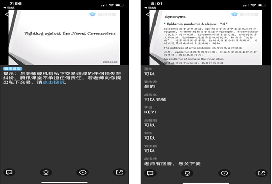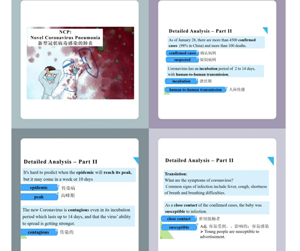 当前人们最为关注的是新冠肺炎疫情。从英语教学角度看,紧紧抓住并巧妙利用这个热点,讲授如何用英语表达新型冠状病毒的点点滴滴,不仅能够激发学生的学习兴趣,并且能让学生有效增加词汇量和拓展知识面,从而使教学既生动形象又立竿见影并事半功倍。为此,各位教师在自己所讲授课程的第一节课中,都为学生们带来相关的知识。
