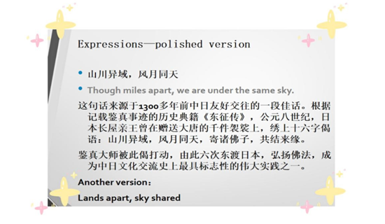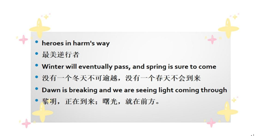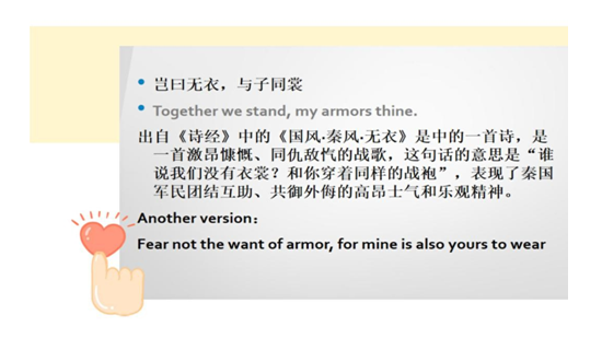 又如,中国古典文学中的“山川异域,风月同天”、“岂曰无衣,与子同裳”,近期因疫情而成为脍炙人口的网红诗句。李莉老师对此进行英文讲解,不仅极大地调动了学生线上学习的积极性和参与度,也让大家进一步掌握了与疫情相关知识和经典古籍的英文表达,使学生在学习专业知识的过程中,学会用英语讲好中国故事,从而达到教书育人的目的。
