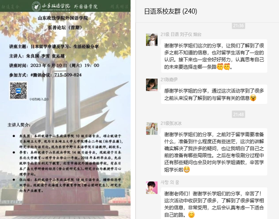 6月10日,专业日语教研室师生相聚云端,举办优秀校友日本留学申请及学习、生活经验分享会。本次分享会邀请到我院日语专业14届毕业生朱良国、18届毕业生李雪和22届毕业生张沁瑶,会议由郭燕梅老师主持,专业日语教研室全体教师、日语专业全体学生及部分其他专业学生参加了此次活动。
