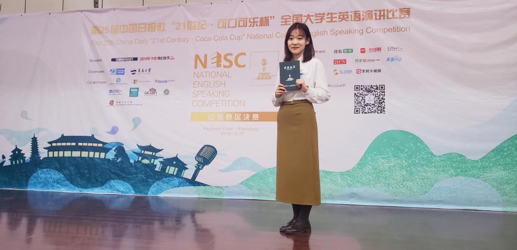 2019年12月29日,由中国日报社与可口可乐中国联合主办、二十一世纪英语教育传媒承办的第25届中国日报社“21世纪•可口可乐杯”全国大学生英语演讲比赛山东省决赛在青岛大学落下帷幕,我院17级英语本科学生刘琦凭借良好的演讲素养获得省级一等奖,苏晓轶老师获得优秀指导教师称号。