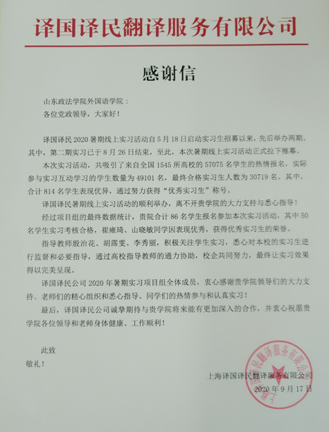 开云电子收到来自校外合作实习基地“译国译民翻译服务有限公司”的感谢信,对我院精心选拔、指导优秀学子参与该公司2020暑期线上实习活动,最终促成活动圆满完成表达谢意。“撷英译坊”殷治花、胡霈雯、李秀丽三位导师获得在线实习指导“优秀导师”称号,两位同学获得“优秀实习生”荣誉。