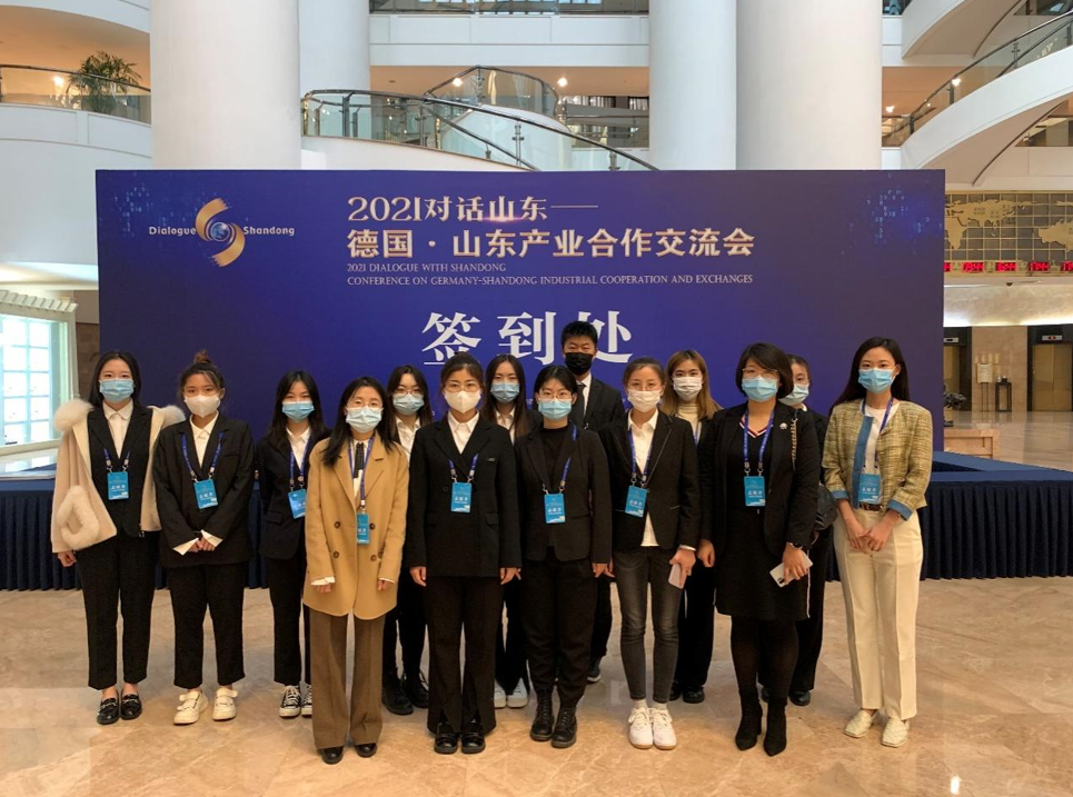 10月27日至28日,山东政法学院开云电子党总支副书记苏晓轶、专业教师胡霈雯、殷治花、宋修涛以及11名学生参加了山东省贸促会主办的“2021对话山东——德国·山东产业合作交流会”,为会议现场提供翻译和志愿服务。