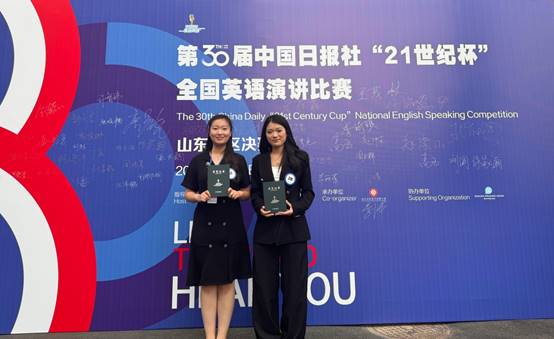 “21世纪杯”全国英语演讲比赛由中国日报社创办于1996年,是国内英语教学界一项重要的文化传播和学术交流平台,也是教育部认可的国内顶尖英语演讲比赛之一。比赛环节设置科学严谨,包括已备演讲、即席演讲和现场问答等,两名同学凭借扎实的语言功底、敏捷的思维逻辑和出色的临场发挥,充分展现了我校学子的卓越风采和过硬的专业素养。