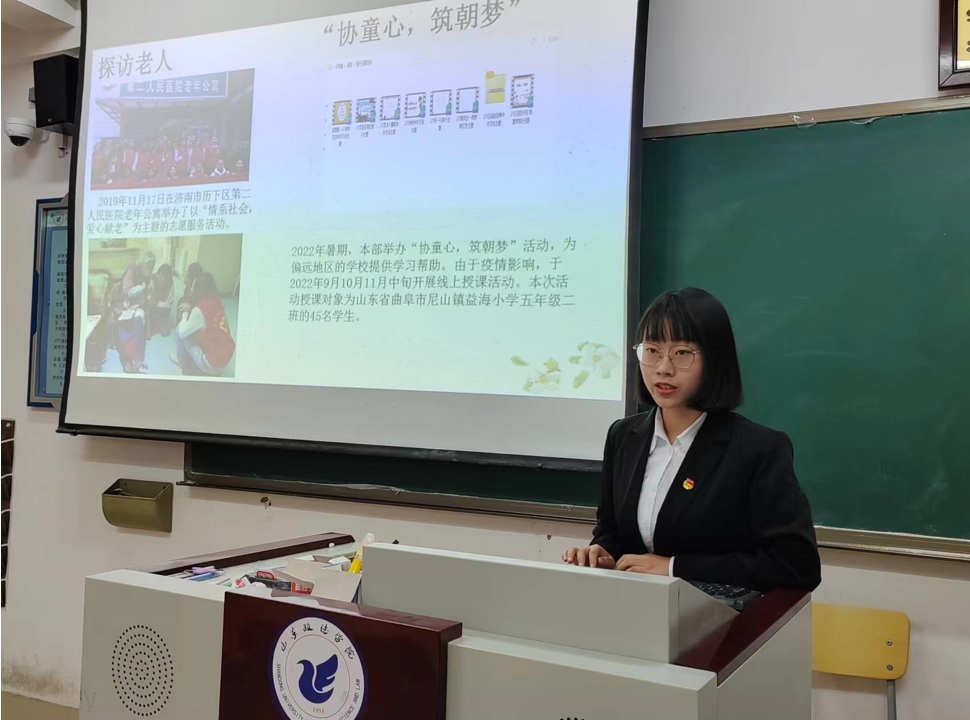 张傲从“是什么”“为什么”“怎么做”三方面讲述了自己对大学生社会实践内涵、意义和方式的理解与认识 。并强调“机遇只偏爱有准备的头脑,我们只有通过自身的不断努力,拿出百尺竿头的干劲,胸怀会当凌绝顶的壮志,不断提高自身的综合素质,在与社会的深入接触中,才能扬起理想的风帆,驶向成功的彼岸。”陶晓晴则从奉献、友爱、互助、进步四个方面讲解了何为志愿服务精神。同时,从便民利民、扶贫帮困、绿色环保等多个方面具体讲述了我院近期开展的各项志愿服务活动。